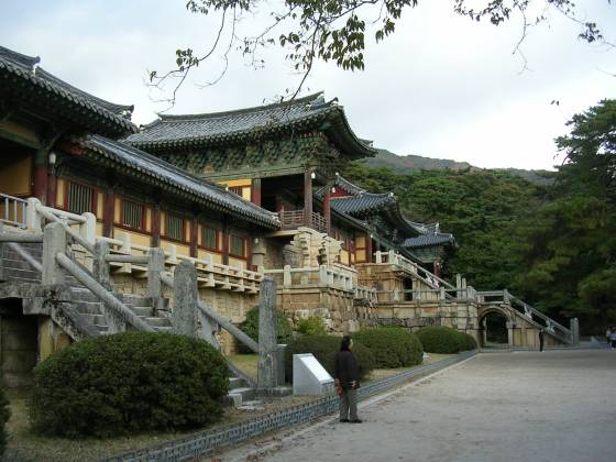 「仏国寺」と書かれた門をくぐり、松の木の茂った境内を抜けると正面に石でできた階段が目に入ります。韓国や慶州の観光ポスターに使われる有名な風景です。向かって右側の階段の上に位置する門は紫霞門。左手にも同じような階段があり、上に位置する門は安養門です。この2つの階段こそが国宝に指定されている青雲橋・白雲橋、そして蓮華橋・七宝橋です。