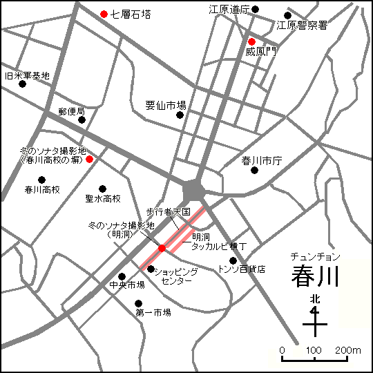 - 中島:北漢江と昭陽江の合流する場所にある春川湖に浮かぶ島