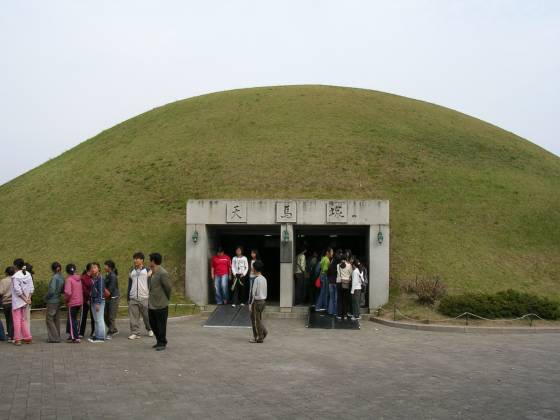 天馬塚は、高さ27.7m・底部の直径47mの巨大な円墳です。5〜6世紀に造られた古墳で被葬者は不明ですが、発掘時には大量の金細工の装飾品が出土しており金冠(国立慶州博物館に展示)が特に有名です。天馬が飛んでいる絵が出土したことから「天馬塚」と名づけられました。大陵苑で唯一内部が公開されており、古墳の様子が実物大で見ることが出来ます。