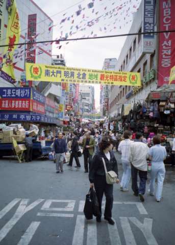 。規模こそは東大門市場に劣りますが、地元の主婦や観光客など、1日に50万人の人が行き来し、いつも活気にあふれる所です。食料品から子ども服、アクセサリー、日用雑貨、厨房用品などあらゆるものを取り扱っており、特に安くてお買い得なのは全体の7割を占める衣料品。2000年観光特区に指定されると共に超大型のショッピングモールもオープンし、昔ながらの在来市場から伝統と現代が共存するショッピングエリアに変貌を遂げつつあります。