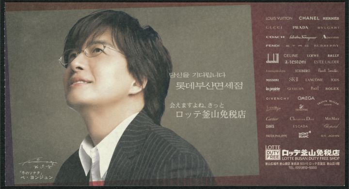 切符の裏は広告。ヨン様の大きな写真で「会えますよね、きっと ロッテ釜山免税店」なかなか素晴らしいコピーですね。免税店に行けばヨン様に会えるような文章が憎い。ロッテ釜山免税店が「会えますよね」と言っているだけで、ペ・ヨンジュに会えるわけではない・・・。紛らわしぞロッテ。