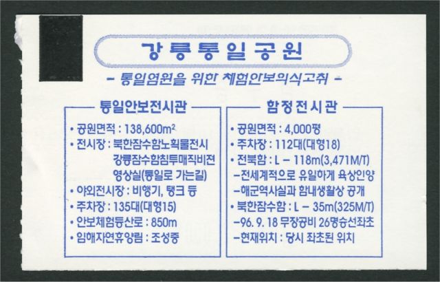 切符の写真は、合成写真のようです。日本海(韓国名:東海)に昇る朝日。左下の緑色の縦看板には「江稜 統一公園 Unification Park」の文字が読み取れます。看板は、道路際に立っているのでバスで行ったときの目印になります。まぁ、看板を探すまでもなく、潜水艦を見つければ統一公園の場所が判ります。看板の横の船は、韓国海軍の退役艦です。白い建物は、山側にある統一安保展示館です。