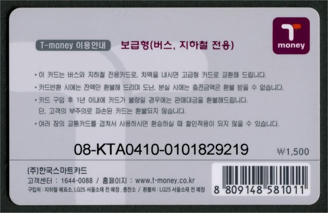 新型交通カードです。非接触型ICカードとなっています。地下鉄とバスで使用でき便利です。LGが作ったカードのようです。LG系のコンビニ(GS25)でも支払いに使えるみたいです。カードに書かれた「Korea Smart Card(韓国スマートカード)」は運営・管理を行っている発行会社のことです。大きく書かれた T money がカードの名称です、一般的に「ティモニカドゥ(T money Card)」で通じます。「T」は、「Transpotation」「Touch」「Top」「Total」「Thanks」などの意味が込められているとのことです。カードについて詳しく知りたい方はT moneyをご覧ください。